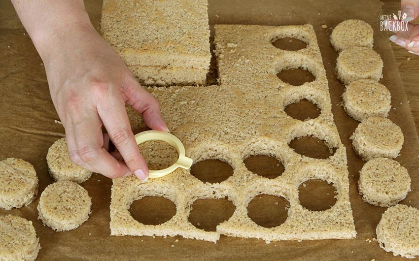 - 250 g Sahne steif schlagen. Das Sahnestand-Pulver von Hobbybäcker- Versand mit Wasser (25 °C) verrühren und die Sahne nach und nach unterheben. Aus dem Kuchen 3 ca. 10 cm große Quadrate ausschneiden und aus dem Rest 18 runde Schichten mit dem runden Zenker Linzer Ausstecher ausstechen.