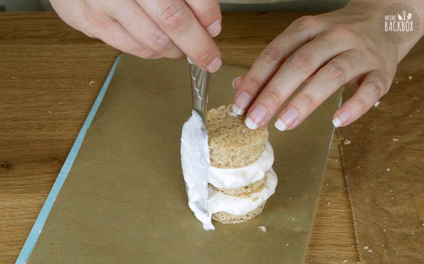 - Es sollte alles mit Creme bedeckt sein, aber nur sehr dünn, so dass die Kuchenschichten noch zu sehen sind. Mit den runden, kleinen Kuchen wiederholen, hier wird es etwas kniffeliger. Alles für mind. 60 Minuten absteifen lassen.