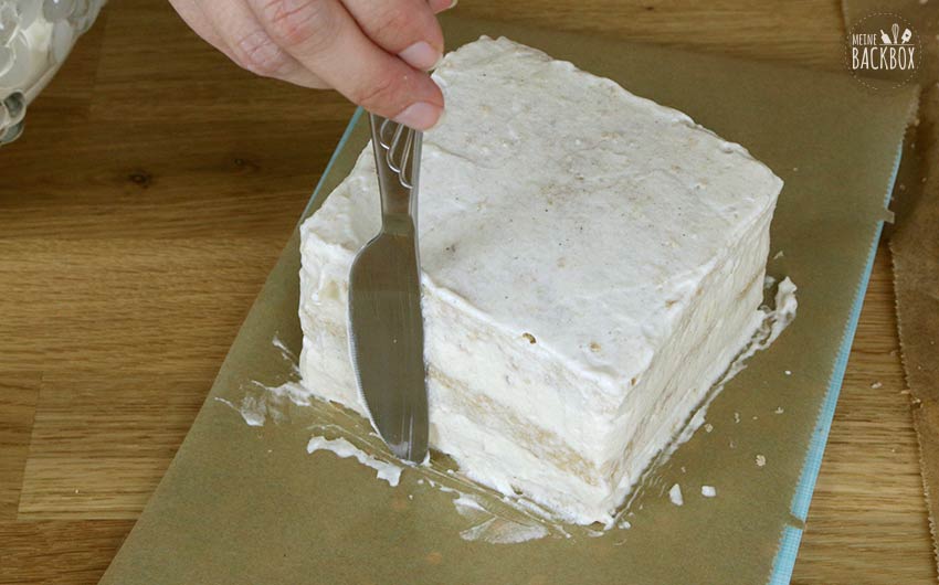 - Die Reste für ein anderes Rezept zur Seite stellen. Nun die erste Cremeschicht des quadratischen Kuchens mit einem glatten Messerrücken auf den unteren Boden auf- und glattstreichen. Den zweiten Boden auflegen, Creme auftragen und den dritten, oberen Boden als Abschluss auflegen. Darauf achten, dass alles gerade ist. Nun eine dünne Cremeschicht oben und an den Seiten entlang streichen.