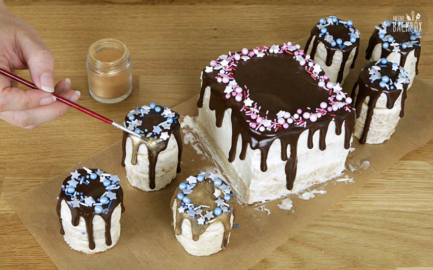 - Wenn die Ganache trocken ist mit einem trockenen Pinsel das Günthart Back & Decor Gold Glimmer aufnehmen und die Ganache damit anpinseln – oder den Pinsel vor die Kuchen halten und leicht darauf pusten, so dass sich ein leichter Gold-Schimmer auf den Drip Cakes verteilt.