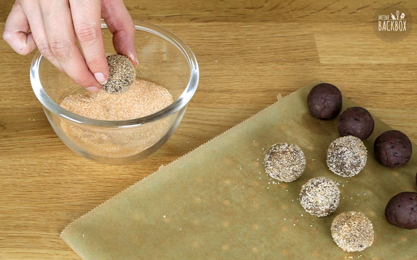 - 2 TL der geschmolzenen Schokolade noch zum Wiener Boden hinzugeben und vermengen. Zu Kugeln formen, dabei die Schokolade im Blick haben.