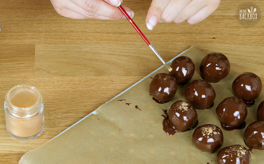 - Wenn die Schokolade die richtige Verarbeitungstemperatur erreicht hat, die Kugeln auf einer Gabel in die Schokolade tauchen, etwas abtropfen und abklopfen und auf ein Backpapier legen.