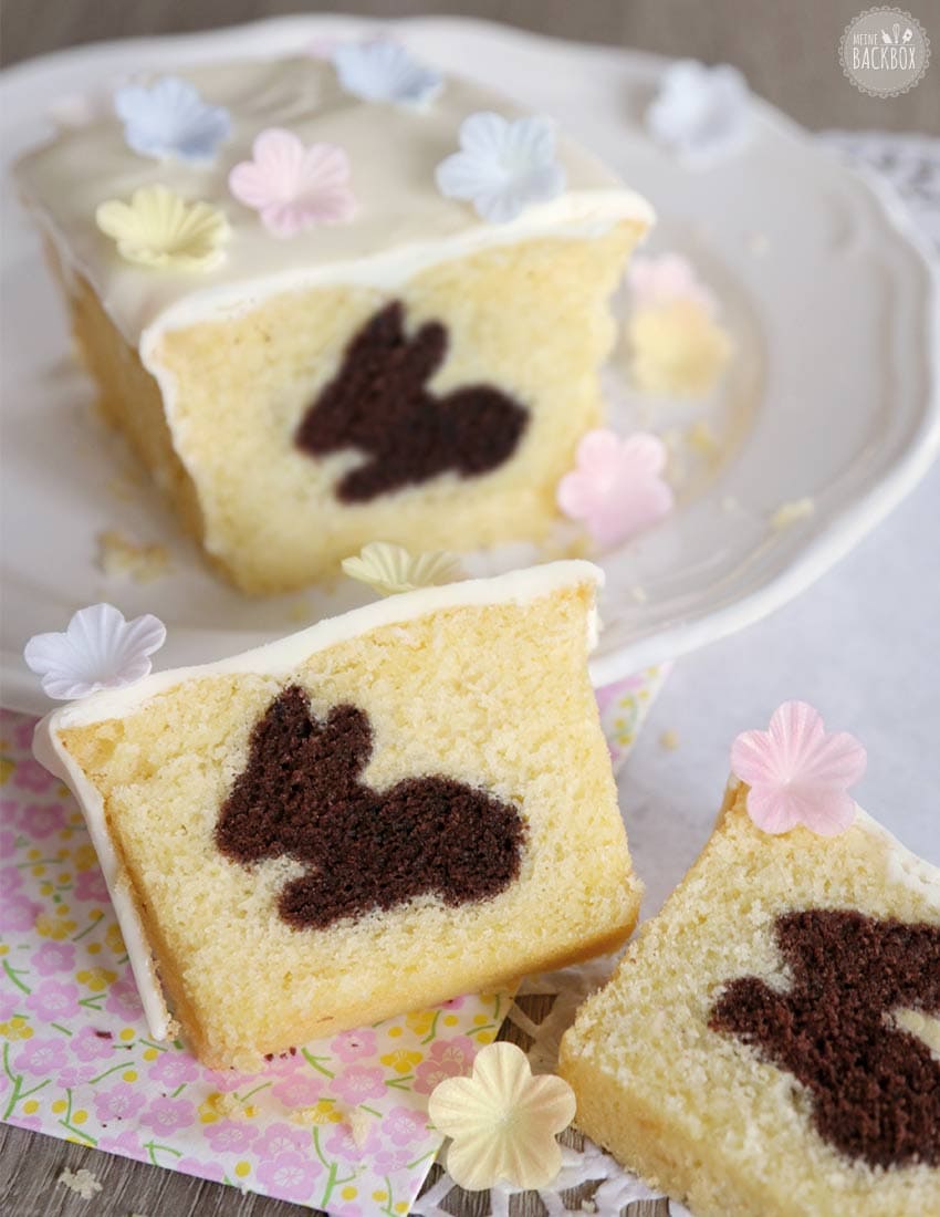 - Die Form säubern und erneut gut einfetten. Ca. 1 cm hoch den restlichen hellen Teig einfüllen und die ausgestochenen Hasen aneinander gereiht in den Teig setzen. Diese nun mit dem übrigen Teig vorsichtig bedecken und wieder etwa 15–20 Minuten backen bis die Stäbchenprobe – im hellen Teig – sauber bleibt. Abkühlen lassen und aus der Form lösen.